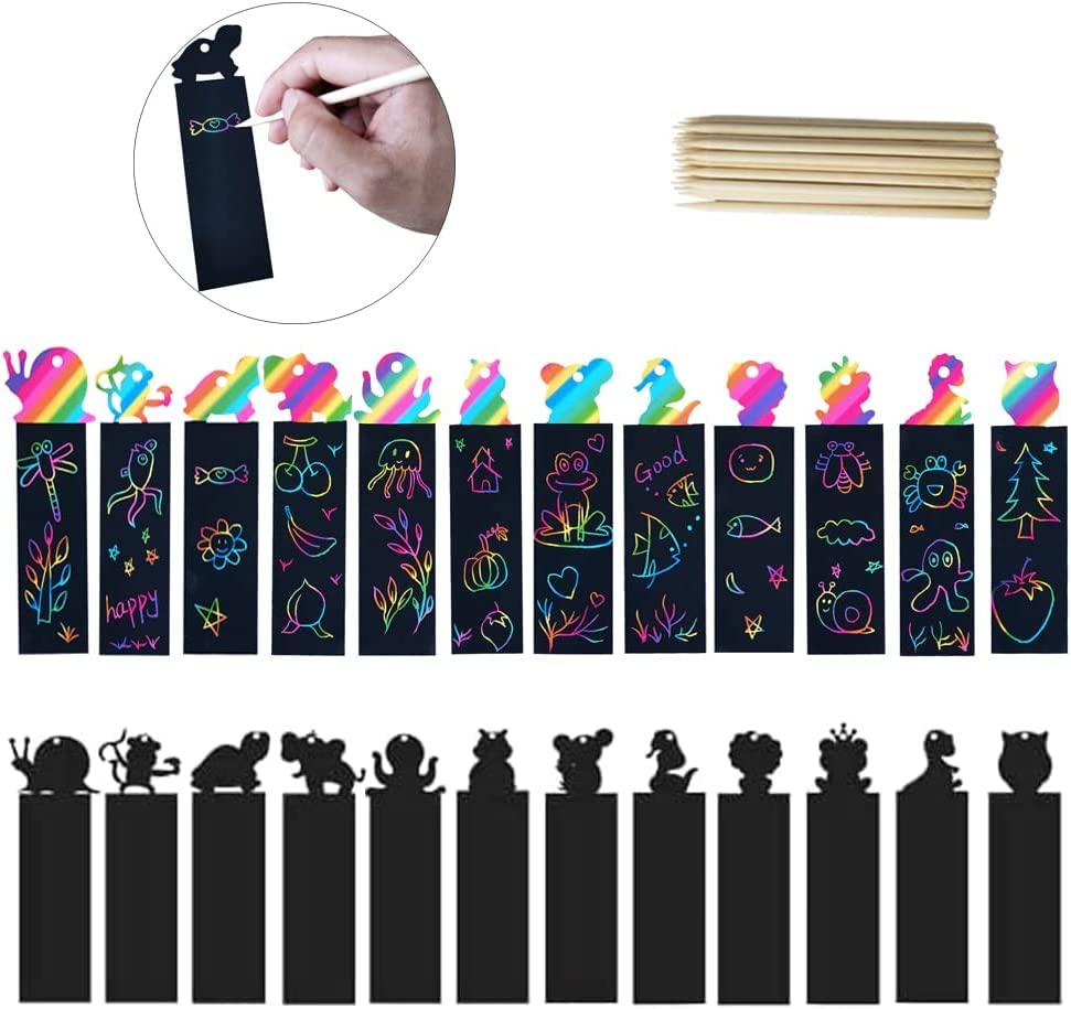 - 【Scratch Bookmarks Set】 Set of 48 animal scratch bookmarks in 12 styles,48 colorful ribbons and 24 wooden stylus,All in one kit for kids to make their own bookmark.